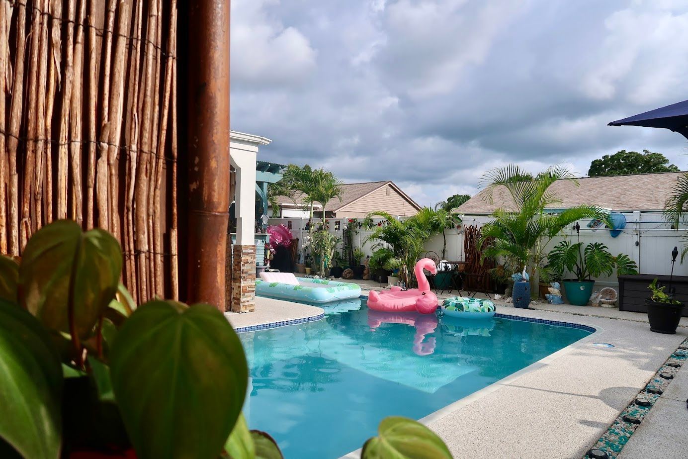 Enjoy our expansive L-shaped pool perfect for cooling off and socializing. Unwind at the covered tiki bar or gather around the fire pit as the sun sets. Kids stay entertained in the secure play area while adults relax. Begin crafting your ideal event in this private tropical oasis today.